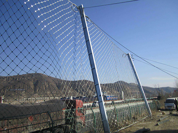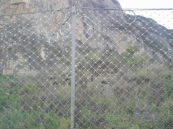 被動邊坡防護網由鋼絲繩網或環形網(需攔截小塊落石時附加一層鐵絲格柵),固定系統(錨桿、攔錨繩、基座和支撐繩)、減壓環和鋼柱四個主要部分構成。鋼柱和鋼絲繩網連接組合構成一個整體,對所防護的區域形成面防護,從而阻止崩塌巖石土體的下墜,起到邊坡防護作用。