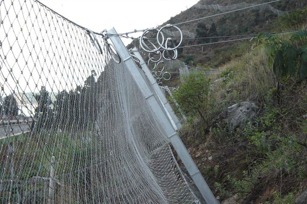 主要構成工字鋼立柱,拉繩錨桿,支撐繩,鋼絲繩網,減壓環。